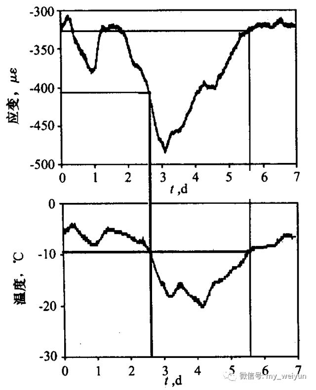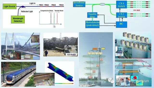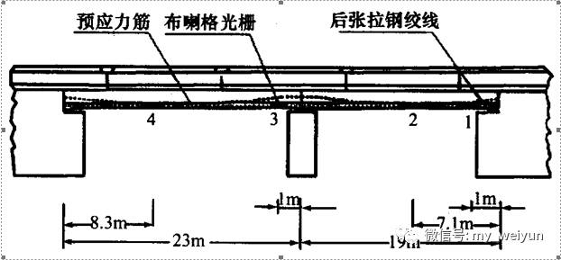 光纤光栅传感器在桥梁工程的应用光纤光栅传感器在桥梁工程中的应用 自光纤光栅传感器于1990 年首次埋入环氧纤维复合材料中以及1992 年首次埋入混凝土梁中以来,大量在桥梁、水坝、管线、隧道、矿厂、核存储容器、天然气压力罐、建筑物以及道路等基础结构的力学参数测量、状态监测中得到应。其中,应用光纤光栅传感器最多的领域之一当数桥梁结构的健康监测。1993 年, 加拿大卡尔加里的Beddington trail 大桥首先使用了光纤光栅进行应力测量并用此方法长期监测桥梁结构。该桥是一座两跨三车道的铁路桥, 这座桥使用了26 片预制的预应力混凝土梁, 其中6 片使用了两种CFRP 材料, 一种是日本东京一家缆索制造有限公司生产的碳纤维复合材料筋, 简称为CFCC;一种是日本的Mitsubishi 化学制品公司生产的碳纤维增强导杆, 简称为CFLR。其他的预应力筋采用普通钢绞线。如图1 所示, 18 个光纤光栅传感器被安装在这3 种不同类型的预应力筋的各个部位上。在安装光纤光栅传感器的时候, 研究人员遇到了一个非常棘手的问题, 那就是如何在混凝土浇筑和振捣时不破坏 图1光纤光栅传感器在Beddingtontrail 大桥上的位置 传感器和光缆。此外, 为了防止光纤受潮气和碱性环境的腐蚀, 还必须使用特殊的套索, 这样还可以减少缩裂与微弯作用, 这两种作用都会影响光纤的整体性, 还会导致光信号强度的减弱。浇筑混凝土时, 必须用振捣棒不停地振捣混凝土, 使混凝土在密集的钢筋笼中均匀分布, 同时必须合理选择光缆的布置路线, 避免光缆在振捣过程中被损坏。光缆沿着钢筋被引入一个接线盒内, 这个接线盒被螺栓固定在模板内侧。在混凝土蒸气养护之前, 接线盒一定要密封, 以避免光缆变脆, 这一点非常重要。如图3 所示, 安装在该桥中的光纤光栅传感器不仅实现了对3 种预应力筋性能的监测和比较, 对混凝土的状态和性能的长期评估,还实现了对交通中的极限荷载以及桥梁荷载历史的监测。 加拿大Winnipeg 的Taylor 大桥是目前记录的使用CFRP 作为预应力筋的最大跨度的桥梁[4 ] 。它的4 片梁和一部分混凝土桥板采用了这种新型材料。该桥总共有5 跨, 总长165m , 宽916m, 每跨有8 片33m 长的工字形预应力混凝土预制。该桥于1997 年10 月28 日开放通车, 是第一座智能桥。这座大桥上装备了一系列光纤布喇格光栅应变传感器(FOS) 和一些普通的应变仪。66 个FBG传感器分布在桥梁中的各个位置用来测量纵向的钢筋和预应力CFRP 筋、横向钢筋和CFRP 筋、CFCC 筋、混凝土板、混凝土挡土墙的应变。图4 显示的是粘贴在CFCC 预应力筋上的FOS33 和IC33 传感器测得的应变和温度随时间变化 的曲线。从图中可以看出, 当温度降低时, CFCC 筋的相对应变增加, 反之亦然。表1 总结了传感器于1998 年1 月30 日、2 月27 日、3 月27 日以及4 月17 日所在的4 个工作周记录下的预应力筋最小相对应变。如表1 所示, 在1 月3 0 日到4 月1 7 日两个工作 周之间, 传感器记录的应变不断增加, 很显然应变增量的一部分是由温度增加而引起的。图5 则显示了在1~4 月间应变测量值和温度测量值的对应关系。在 该桥的监测过程中, 现场解调系统和计算机从光纤光栅传感器上获得并存储信息, 并通过电缆线与遥远的中央监测站相连, 从而实现了对该桥的长期实时健康 监测。不同时段、不同温度条件下的预应力筋 最小相对应变测量值[4 ] 表1 传感器ID 最小相对应变με 26 - 30/ 01/ 98 23 - 27/ 02/ 98 23 - 27/ 03/ 9813 - 17/ 04/ 98 温度( ℃)- 20 - 10 2 2 FOSl - 1150 - 950 - 480 - 220 FOS57 - 720 - 580 - 280 - 120 FOS73 - 1525 - 1400 - 1085 - 920 FOS33 - 480 - 320 - 20 140 FOS34 - 650 - 660 - 300 - 90 FOS37 - 820 - 700 - 400 - 265 图5FOS73 记录的应变和温度数据(1998年1 - 4 月) 加拿大的Confederation 大桥是世界上跨在被冰覆盖的海洋上的最长的桥梁, 它的跨度为1219km , 箱梁设计为中空, 以便于作为电讯设施的有用通道。该 桥部分混凝土箱梁高达14m , 一辆双层公共汽车可以从中通过。这座大桥中安装了一系列光纤布喇格光栅传感器对桥梁进行了健康监测。俄勒冈哥伦比亚河谷上的Horsetail fall 桥是一座古老的桥梁, 它于1914 年建成, 原为混凝土结构, 当初的设计不能满足现今的交通要求, 后来采用纤维增强塑料复合材料对桥梁进 行了加固, 为了监视加固后的结构情况, 把28 个光纤光栅传感器安装在两片复合材料加固的混凝土梁上, 从1998 年开始至今, 每个月用便携式光谱仪测量一次数据。佛蒙特大学的Fuhr 和Huston 领导的研究小组用光纤光栅传感器远距离监测沃特伯里佛蒙特光纤光栅传感器在桥梁工程中的应用与研究现状 3 存在的问题及对策 311 应变与温度交叉敏感问题 光纤光栅的中心波长不仅与加在光纤上的应变有关, 而且还受温度的影响, 二者引起的波长变化是线性的。当温度在- 20~60 ℃范围变化时, 光栅中心反射波长变化约1nm , 严重影响了其在应变测量方面的应用。为了克服这种交叉敏感效应, 人们提出了一些解决方案。其中大部分方案是采用两个或两个以上的光纤光栅组合来克服交叉敏感问题[8~9 ] , 也有方案采用光纤光栅FOP腔来实现温度与应变的同时测量, 还有其它的一些方案, 如利用负温度膨胀系数材料, 对光纤光栅进行温度补偿封装来解决光栅的温度漂移问题。这些方案有的需要两个解调光源, 增大了系统的复杂性, 也增大了成本。有的方案则失去了光